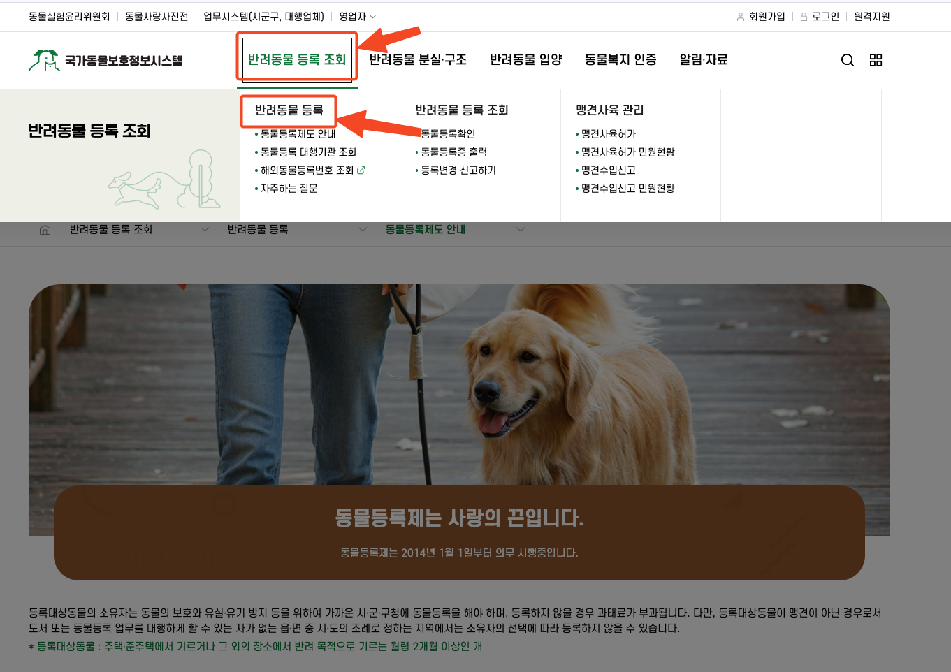 - 등록 대상: 생후 2개월 이상 반려견(고양이는 자율 등록 가능)