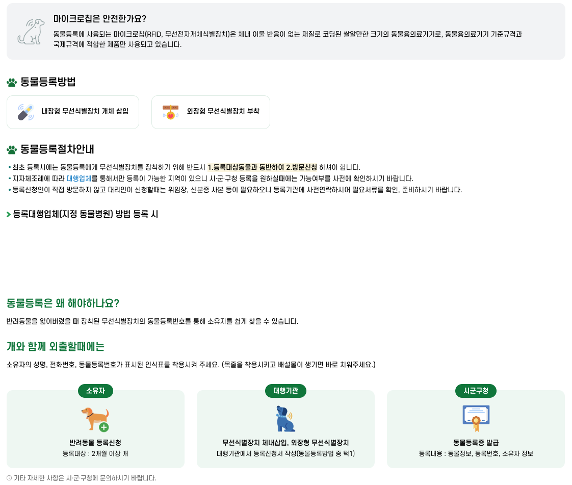 - 목적: 유실 시 보호자·동물 신속 식별, 유기·학대 예방
